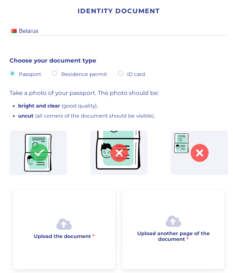 Citizens of the Republic of Belarus must also upload a photo of page 31 of the passport (spread). Identity documents include a national passport/ID card, residence permit or other equivalent document confirming identification data: