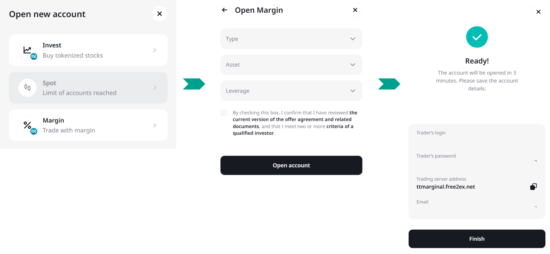 After successful registration and verification on the FREE2EX platform, you can open a margin account to trade with leverage.
