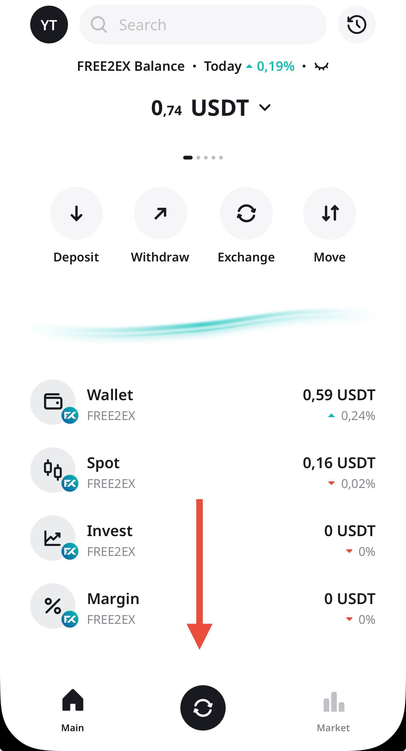 The “Move” button is on the main screen of the app: Tap the “Move” button to move assets between your wallet and your Invest*, Trade, and Margin* accounts: select the account you want to transfer assets from, and the account you are transferring to, ...