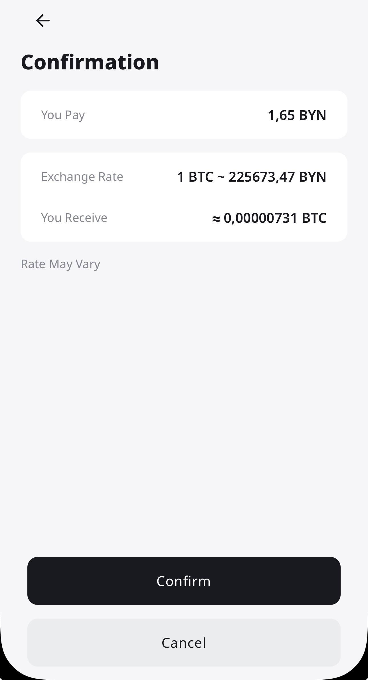 The “Exchange” button is on the main screen of the app: You can also use the central icon at the bottom of the screen: In the Exchange section, you can exchange: cryptocurrency to fiat fiat to cryptocurrency cryptocurrency to cryptocurrency Select ...