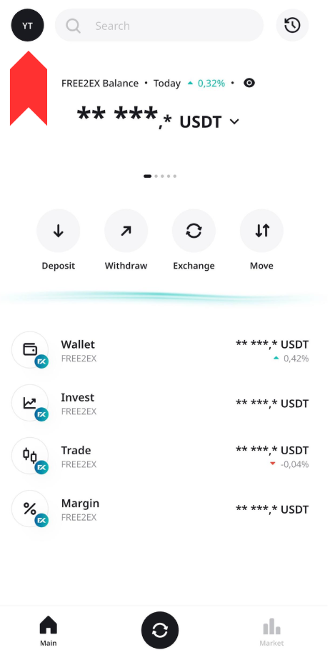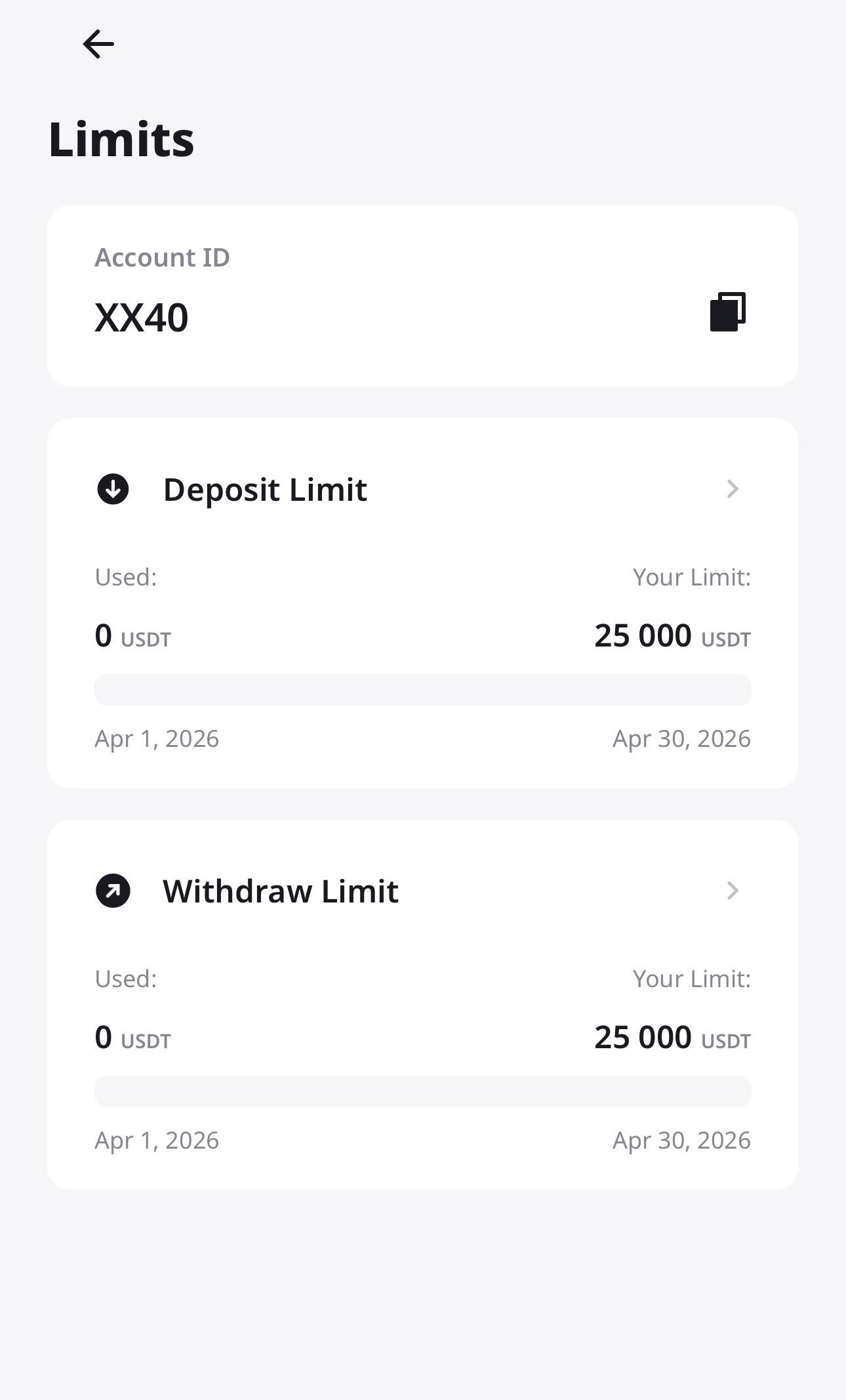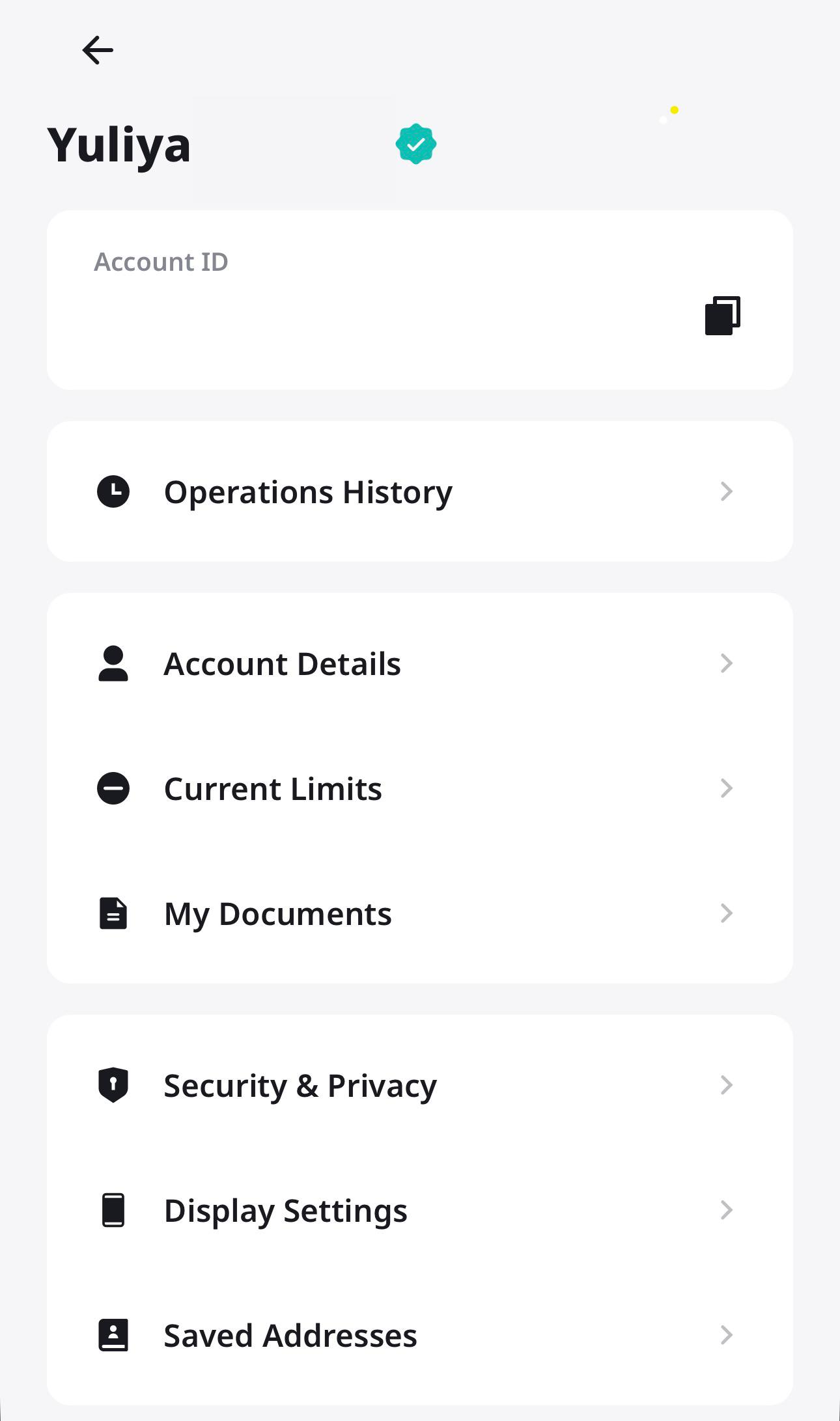 At the very top, your Account ID is displayed - you can copy it by tapping the copy icon. Below, you will find the main menu panel: