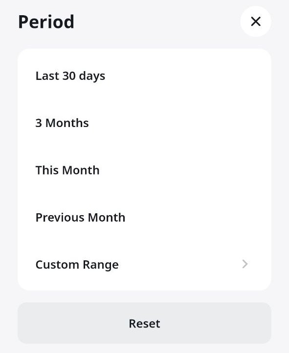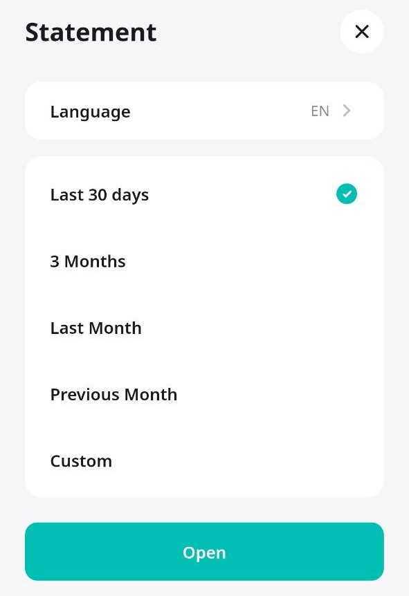 To download an account statement, tap the arrow icon in the top right corner: choose the document language and period (or set it manually), then click «Open»: