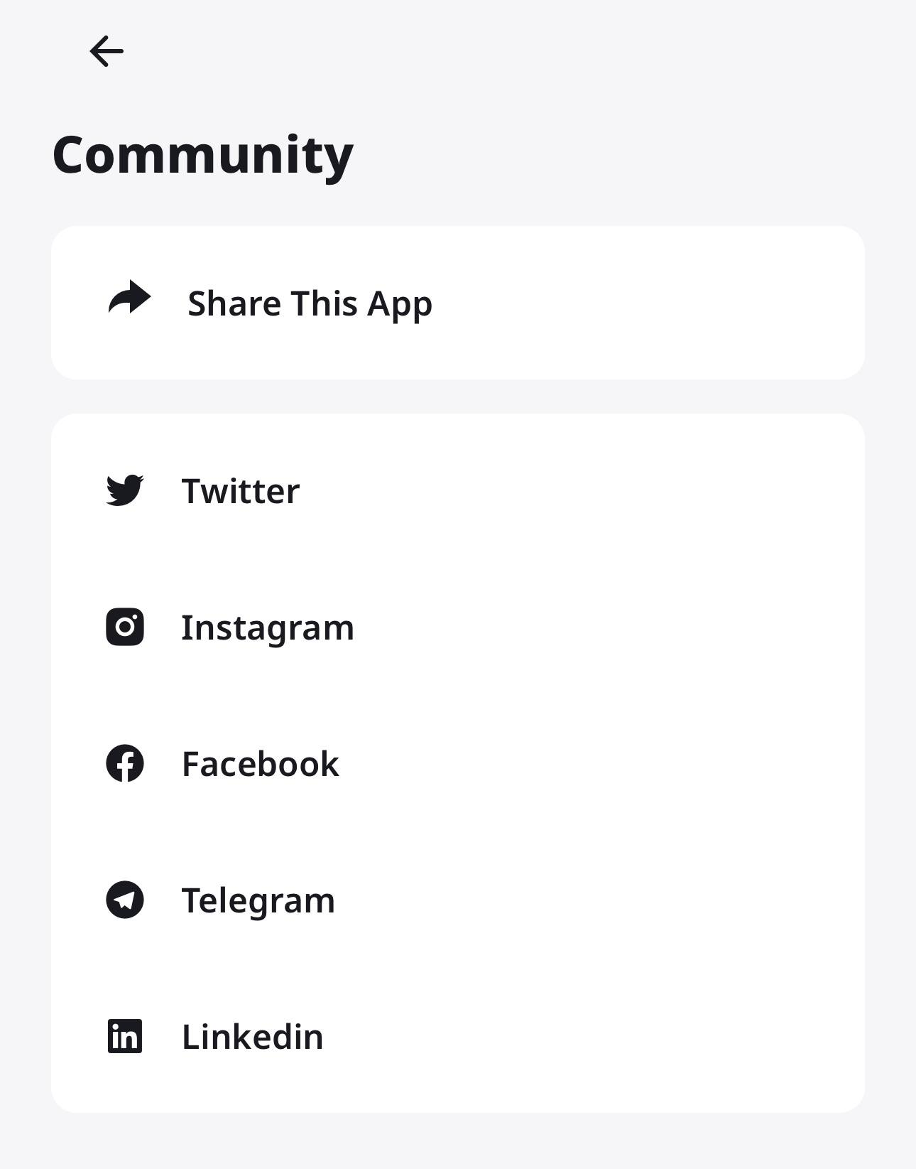 Here you can share a link to the app with your friends and colleagues, and visit our social media pages: