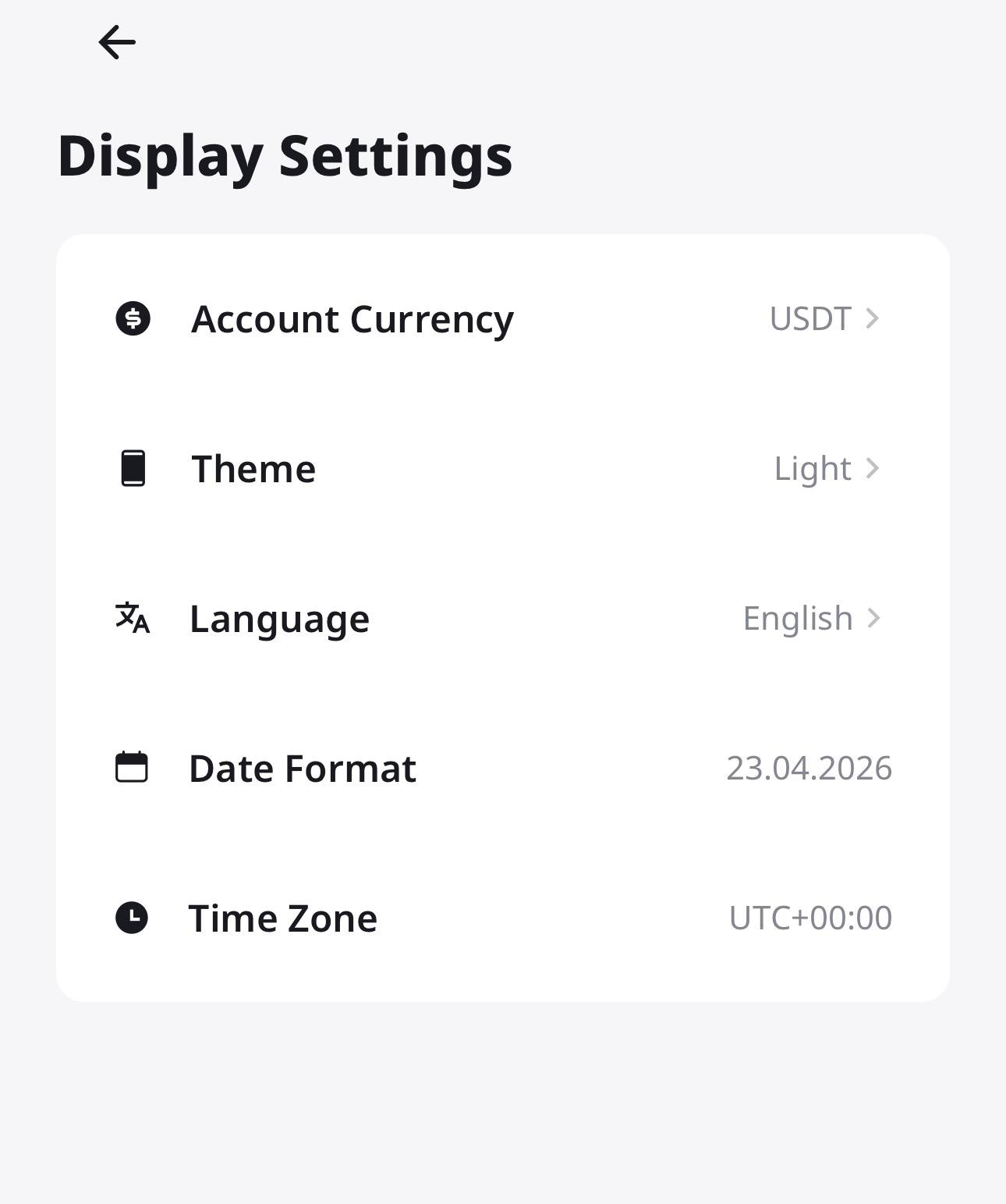 In this section, you can select your account currency, theme, and language. Changing the date format and time zone is currently not available: