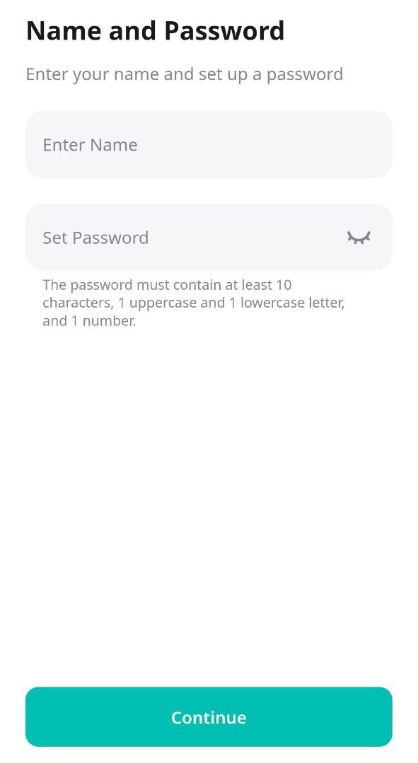 4. Provide your name and create a strong password. Then click «Continue»