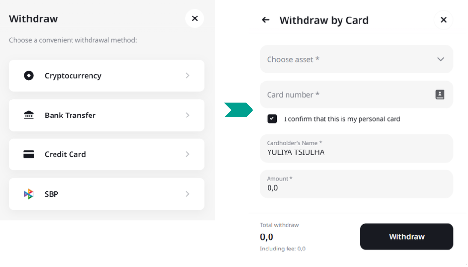 1. In your personal account, select Withdrawal -> Credit Card: