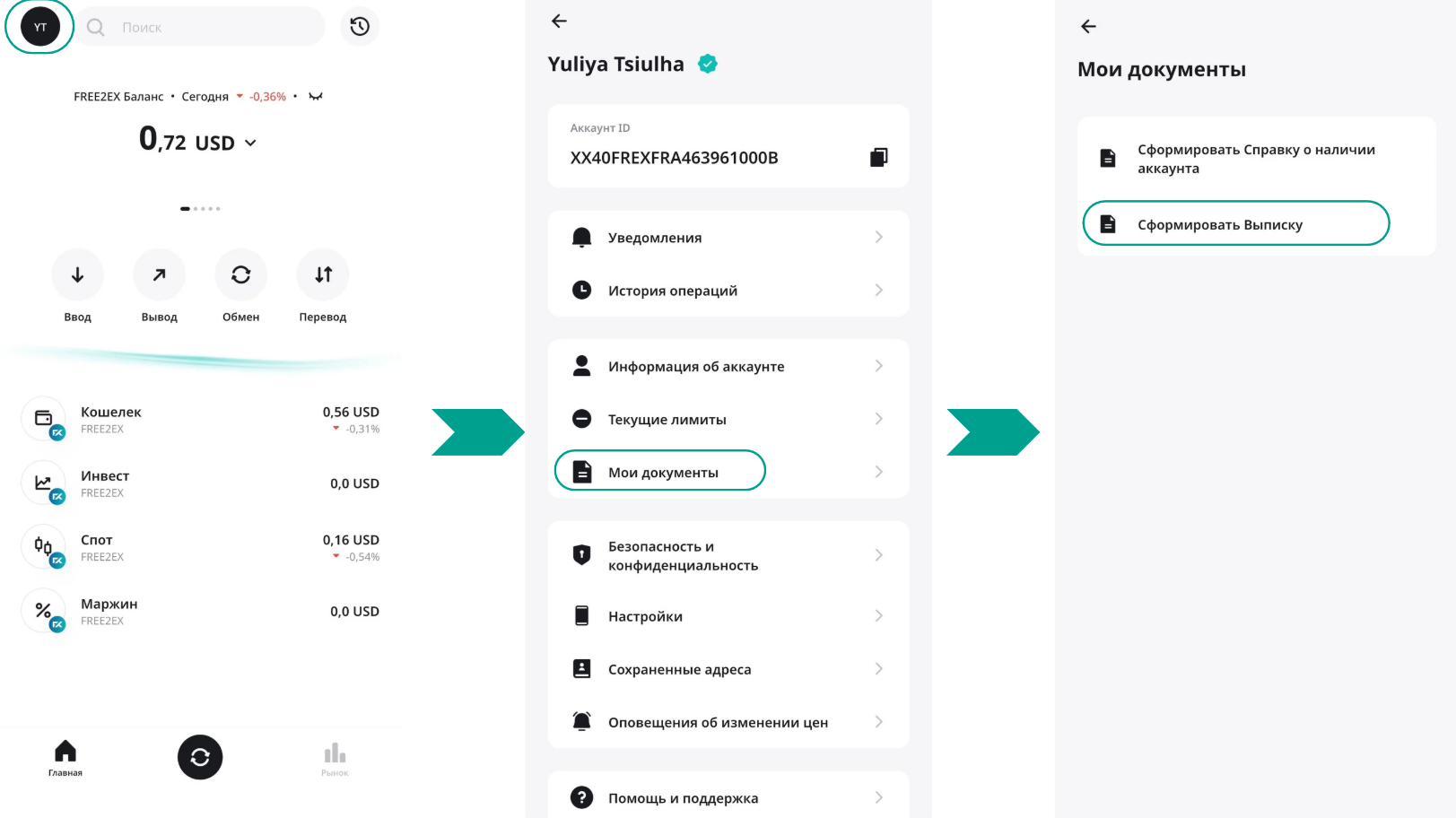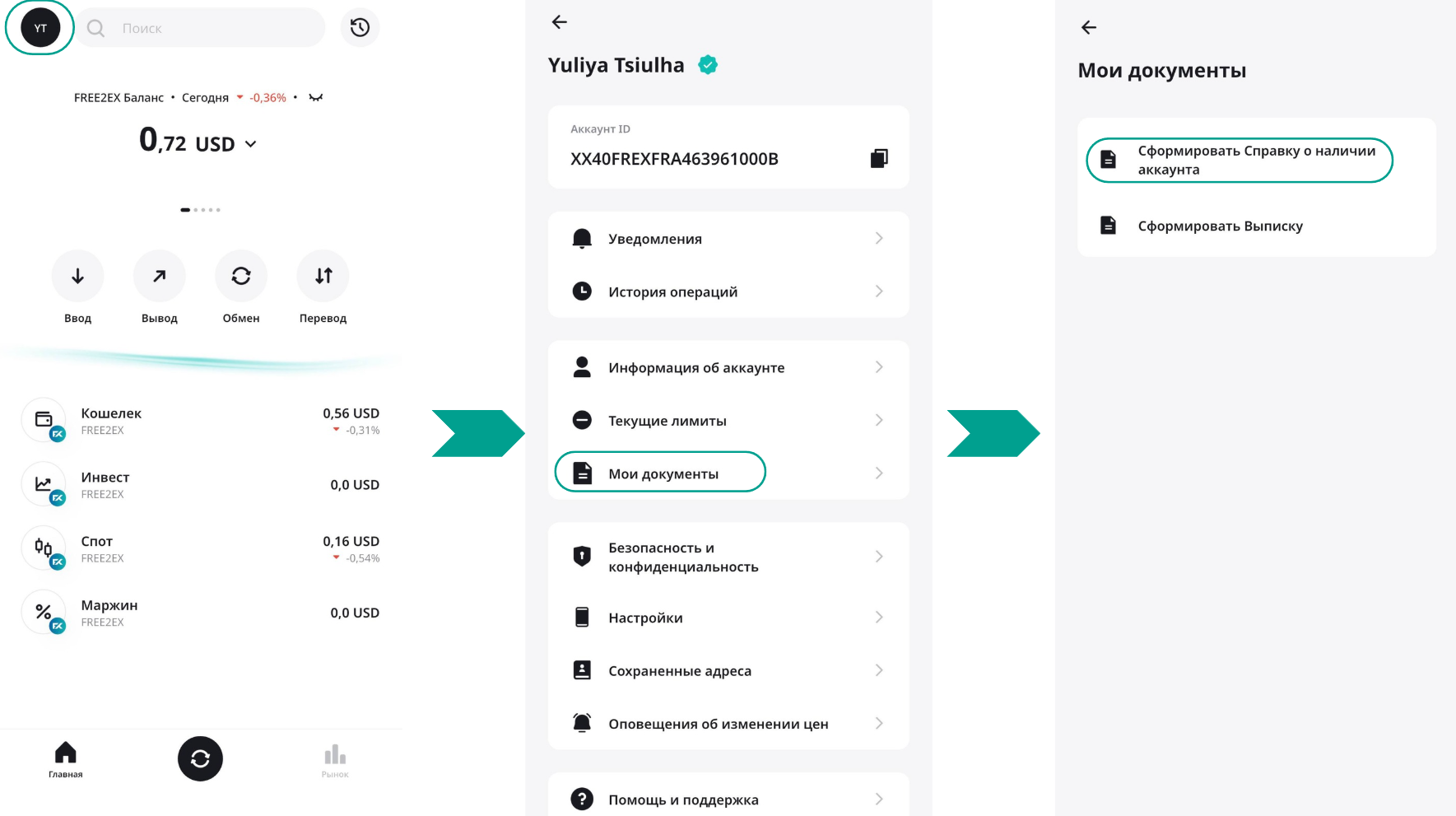 В приложении FREE2EX Wallet перейдите в Аккаунт -> Мои документы: