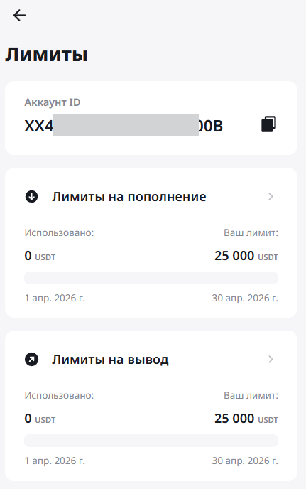 Раздел содержит информацию о сумме активов, поступивших на ваш аккаунт и/или выведенных с него в рамках ежемесячных лимитов на вывод и пополнение: