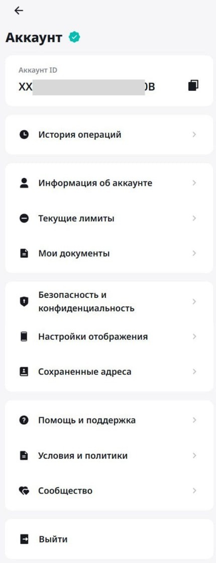 В самом верху указан ваш Аккаунт ID, который можно скопировать, нажав на иконку копирования. Ниже находится панель главного меню: