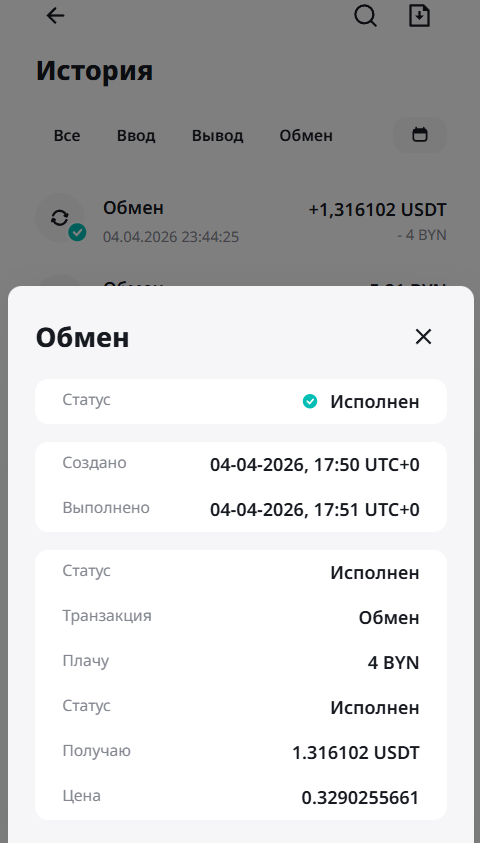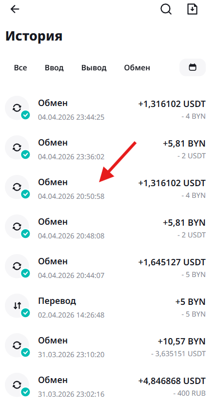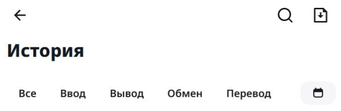 В этом разделе вы найдете информацию по своим операциям с активами. Можно сразу перейти в нужную вкладку по типу операции: Все, Ввод, Вывод, Обмен, Перевод: