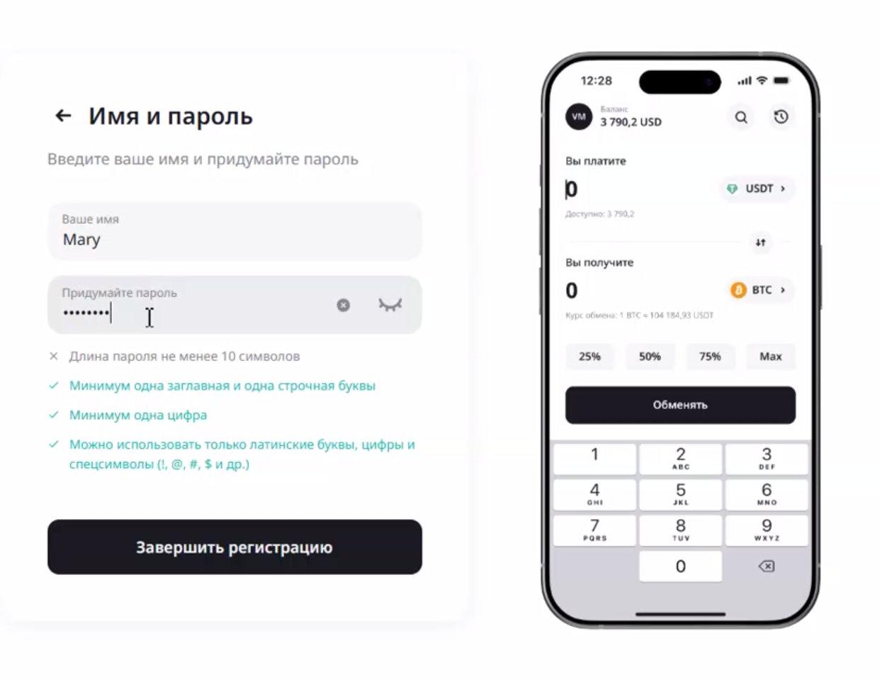 4. После этого введите ваше имя и придумайте пароль для входа в личный кабинет. Пароль имеет ряд требований: не менее 10 символов латинского алфавита (кириллица не подойдет), минимум 1 заглавная и 1 строчная буквы и минимум 1 цифра.