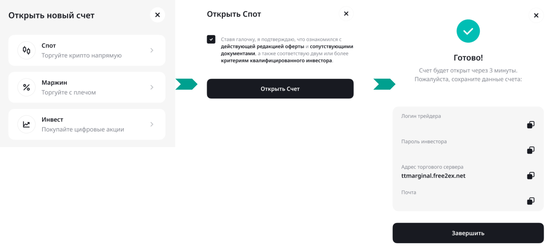 Ознакомиться с условиями открытия торгового счета и проставить галочку об их принятии, после этого нажать на Открыть Счет.