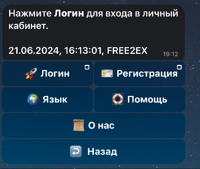 Далее следуйте указаниям бота для регистрации вашего аккаунта. Вы также можете ознакомиться с нашей статьей “Как зарегистрироваться на FREE2EX”.