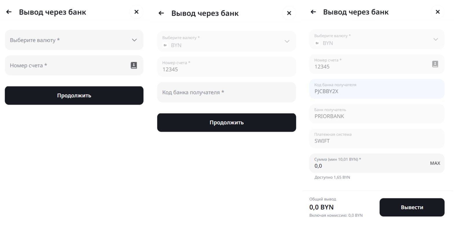 На нашей платформе доступен вывод следующих фиатных валют: USD, EUR, BYN и RUB.