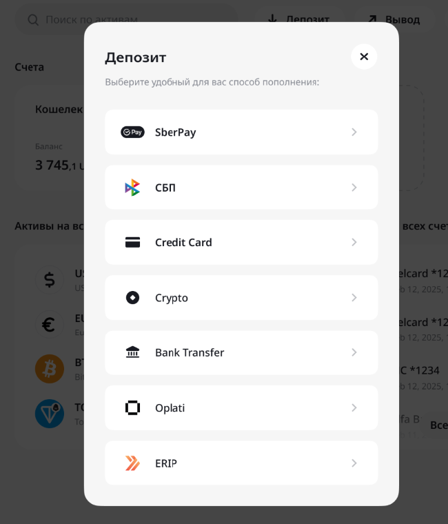 На нашей платформе мы предлагаем пополнение счета в таких денежных валютах, как USD, EUR, BYN и RUB. Наши актуальные комиссии размещены на сайте: Комиссии У вас есть возможность пополнить аккаунт на платформе FREE2EX с помощью карт, благодаря нашей ...
