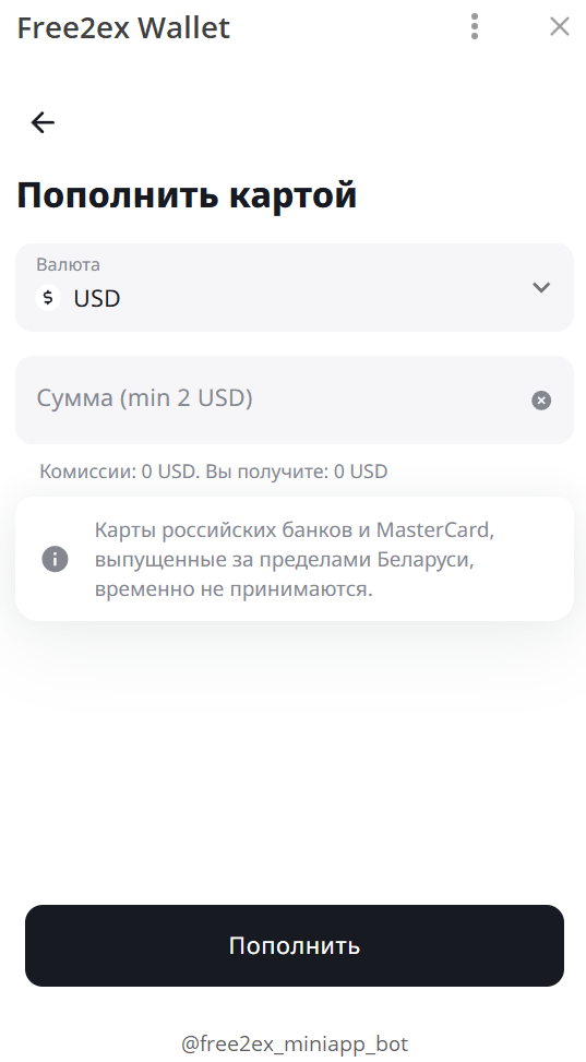 Выберите нужную валюту, напишите сумму и нажмите кнопку «Пополнить»:
