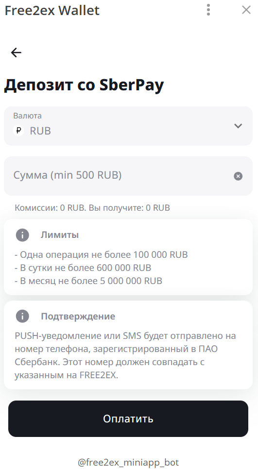 Номер телефона, указанный на FREE2EX, должен совпадать с зарегистрированным в ПАО Сбербанк. На этот номер будут отправлено PUSH-уведомление или SMS.