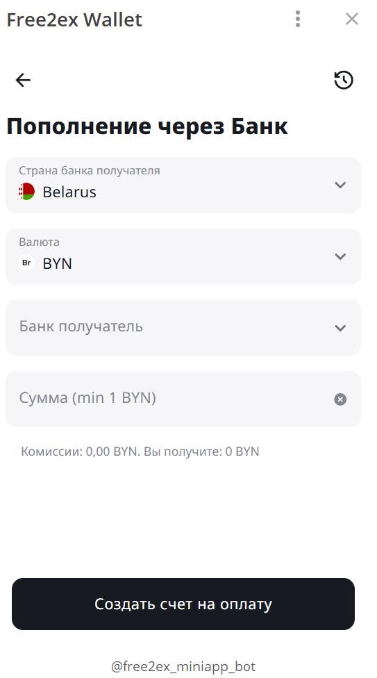 Выберите страну, валюту, банк-получатель и введите нужную сумму на пополнение. Нажмите «Создать счет на оплату»: