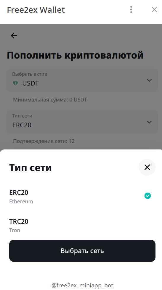 В зависимости от выбранного актива вам может понадобиться выбрать сеть или сеть подставится автоматически: