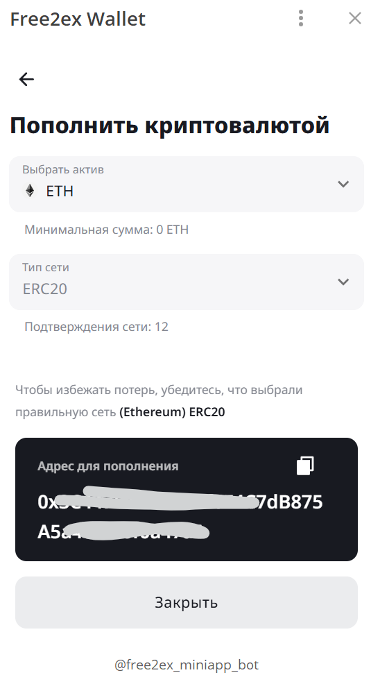 Далее вы получите адрес, на который будет осуществляться пополнение криптовалютой.