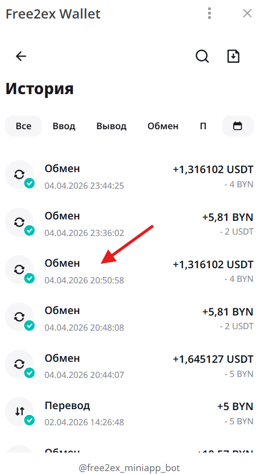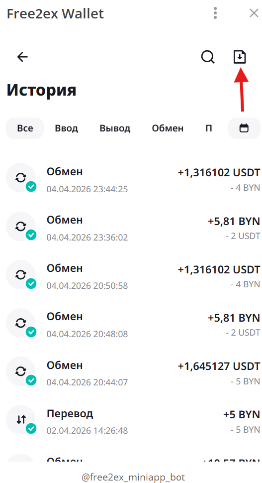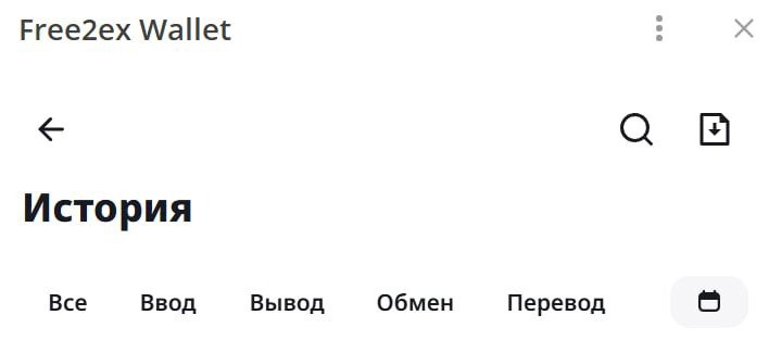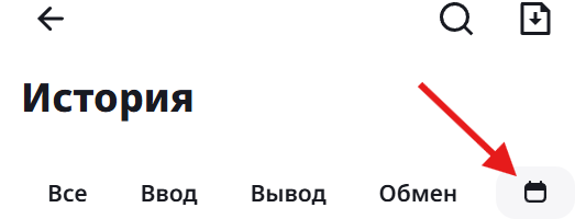В этом разделе вы найдете информацию по своим операциям с активами. Можно сразу перейти в нужную вкладку по типу операции: Все, Ввод, Вывод, Обмен, Перевод: