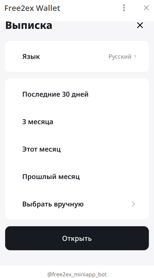 Чтобы скачать выписку по счету, нажмите на иконку со стрелкой в правом верхнем углу: выберите язык документа и период (или задайте вручную), и нажмите «Открыть»: