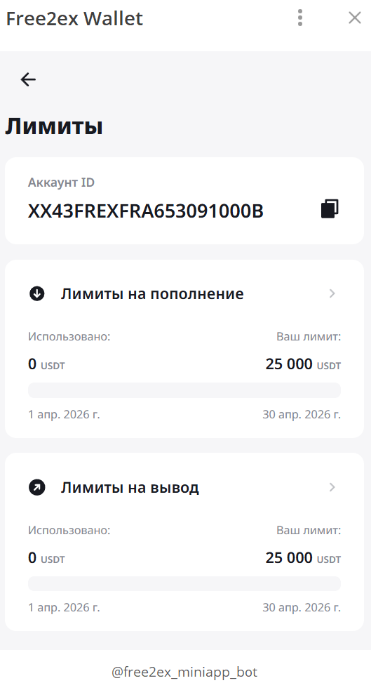 Раздел содержит информацию о сумме активов, поступивших на ваш аккаунт и/или выведенных с него в рамках ежемесячных лимитов на вывод и пополнение:
